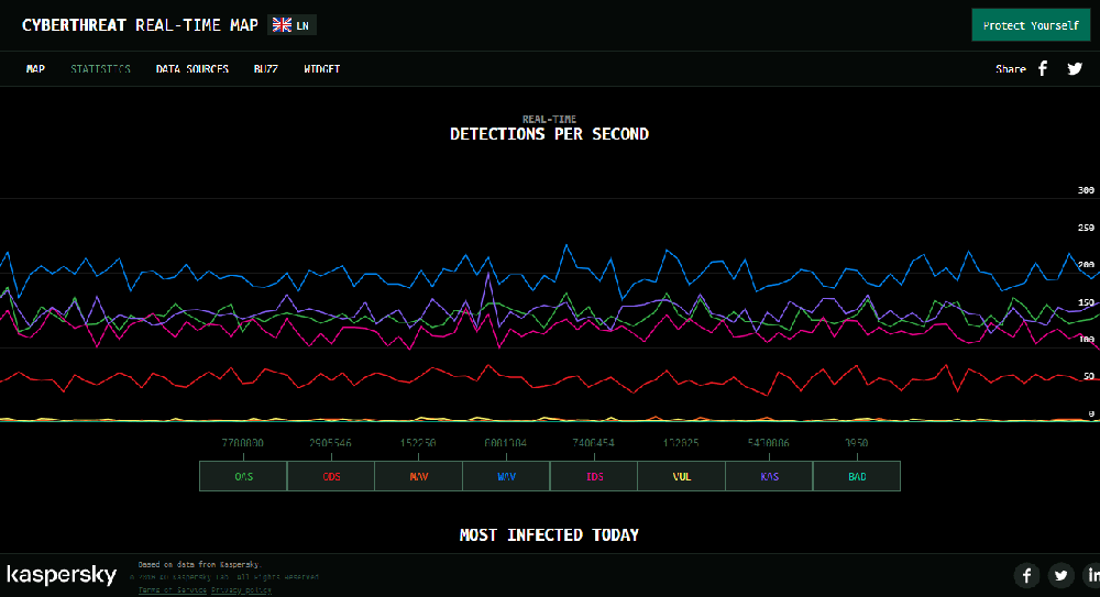 Kaspersky’s cyber threat map may be the best in the business in terms of interactivity and visual appeal. It also offers useful statistics about current cyber attacks. Through its website, you can learn about: