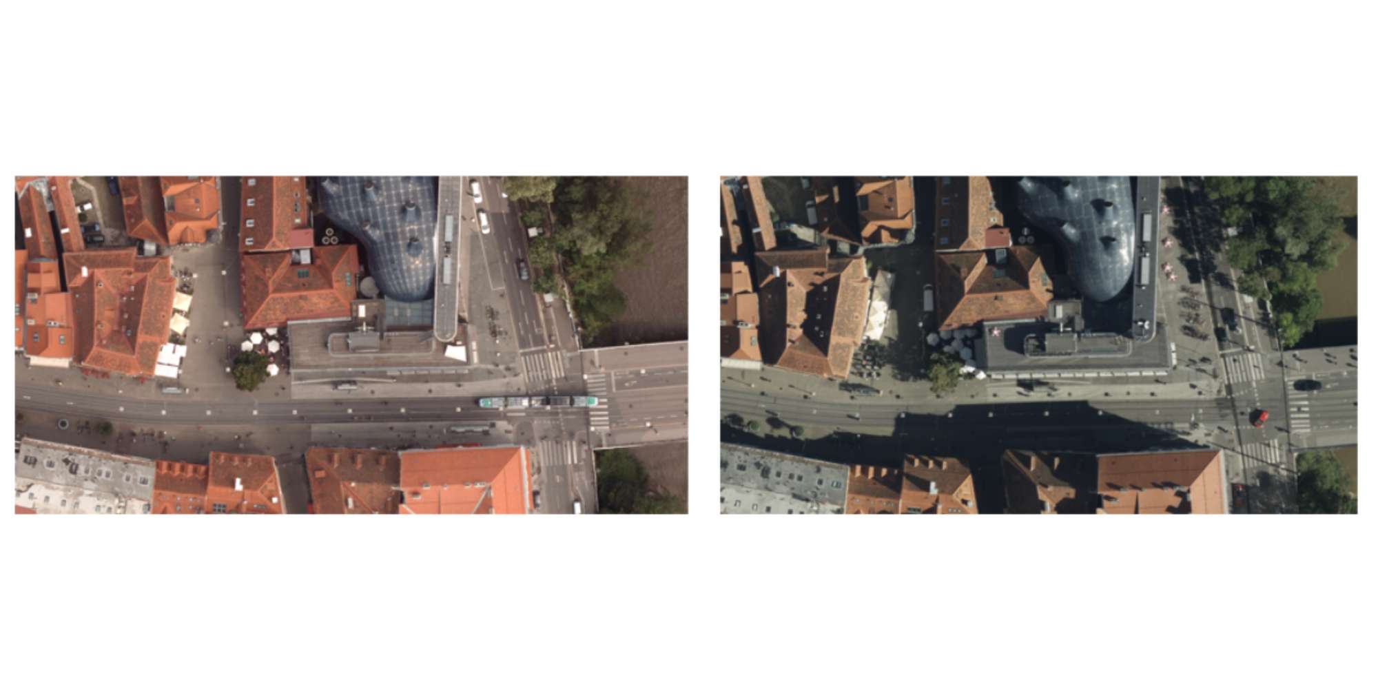 We offer extensive options to adjust images as needed. Depending on the application, different settings can be applied. For example, a scene captured under diffuse light with a thin cloud cover on the left shows no shadows, while the same scene under strong sunlight on the right has significant visible shadows. This example demonstrates that despite our many adjustment capabilities, certain initial conditions may prevent perfect image matching.