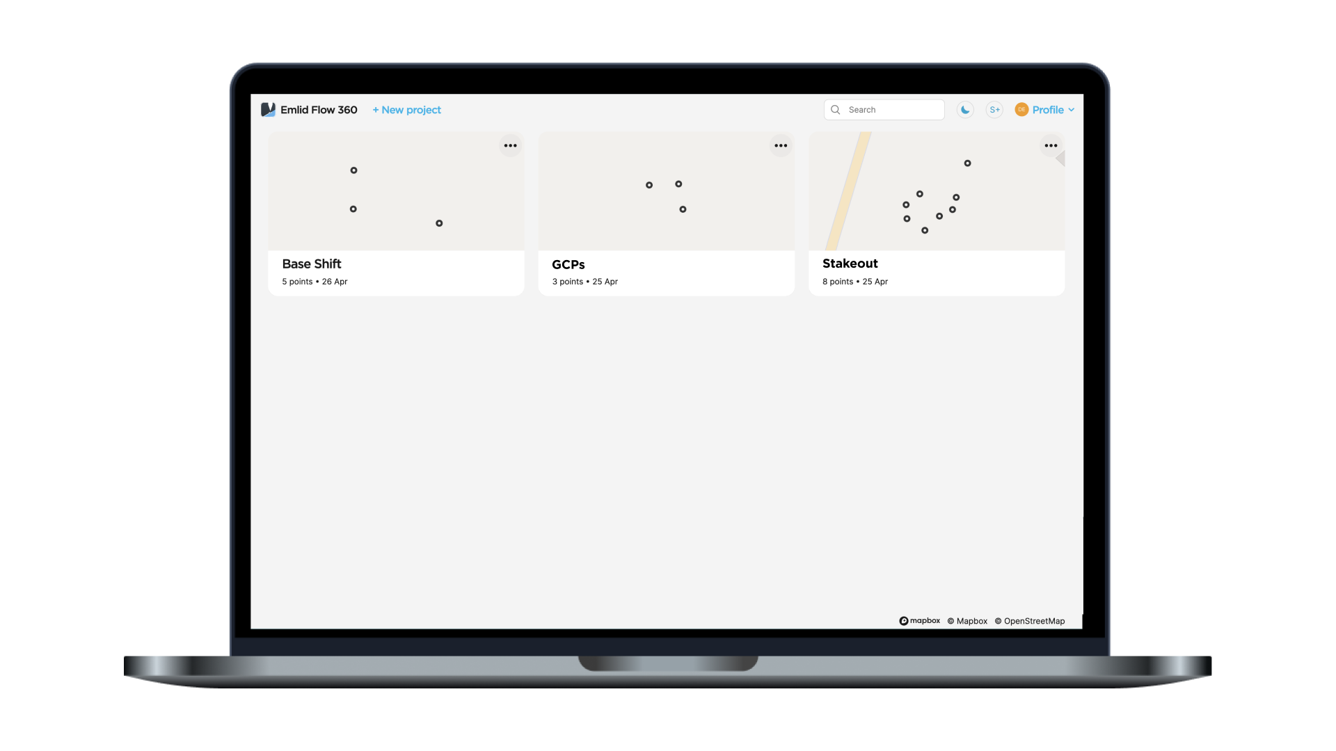The Emlid Flow app is synchronized with a cloud-based service Emlid Flow 360. It allows you to access and manage survey data from the browser at flow360.emlid.com.