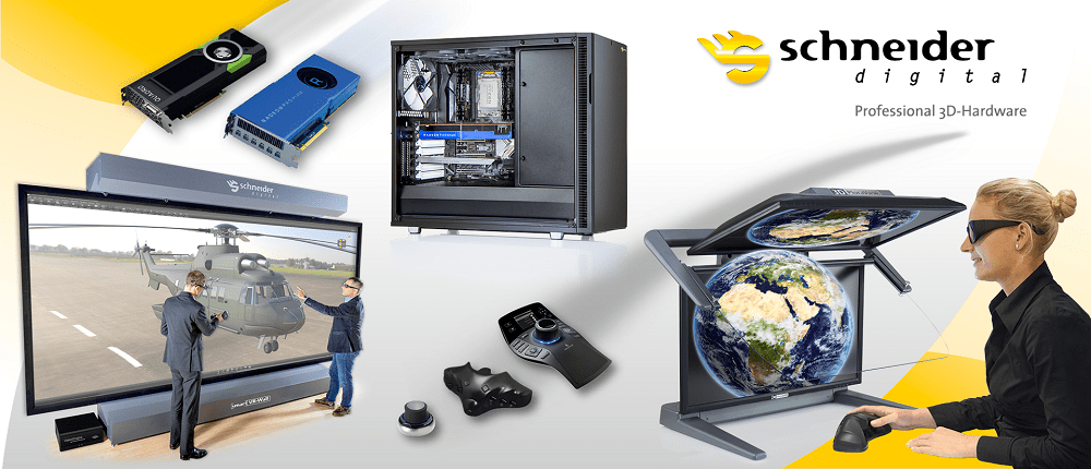 Schneider Digital is a globally active, full-service provider for professional 3D-stereo, 4K/8K and VR/AR hardwaresolutions. Schneider Digital supplies you with the optimal monitor-, workstation-, graphics- and peripheral devices for demanding applications in the geospatial sector, meeting the highest requirements for 3D-Stereo and VR/AR systems.