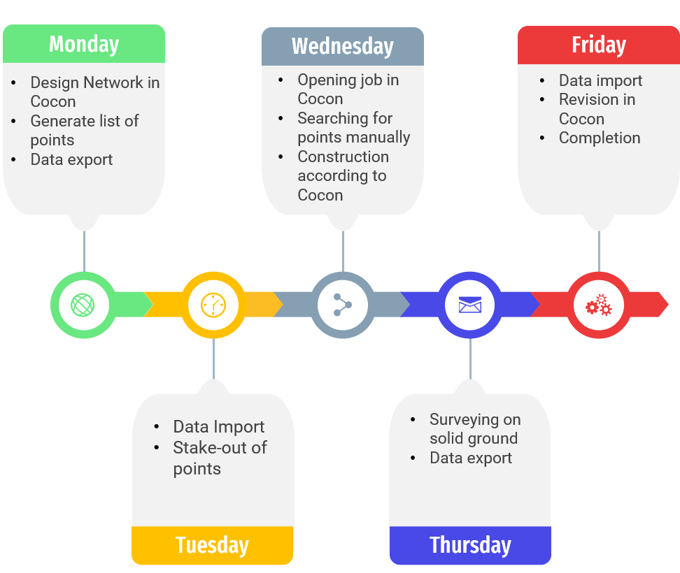 It used to be common to choose a design network in a programme such as Cocon. You’ll use Cocon to generate a list of points and make the actual data export after that. That is a one-week job, as you see in the picture to the right. You haven’t even started with collecting new information yet, this is just some work to prepare yourself for that task! This takes a lot of time, right? Surveying one project can take up to one week, and that’s when everything goes exactly as you have planned. We have not even mentioned what happens when you get an error during surveying, or experience a problem that requires a few extra days to be fixed! That’s frustrating, right? Not only frustrating, but this adds also more days to your planning and extra money to the overall costs of this project. Nobody wants that.